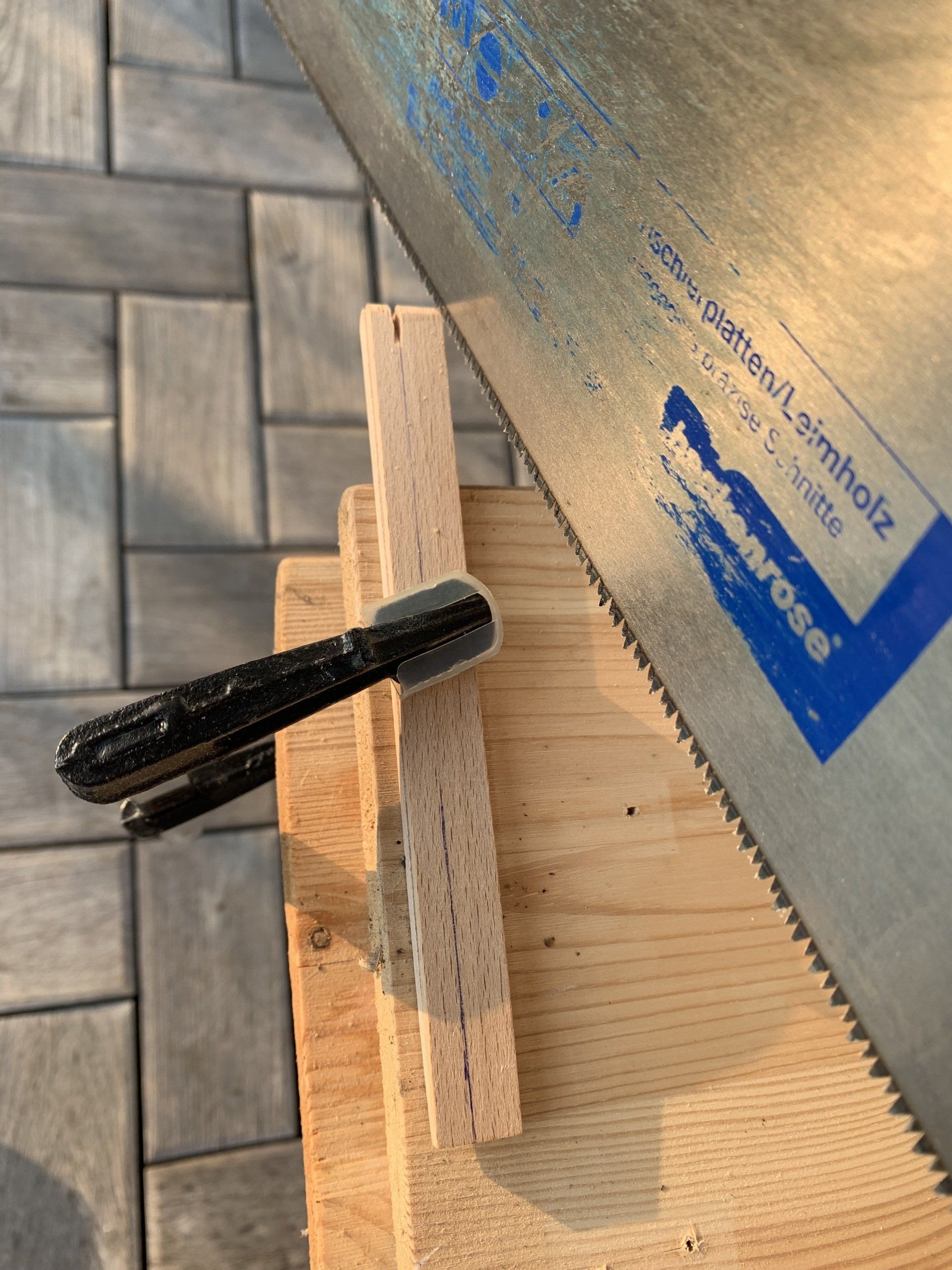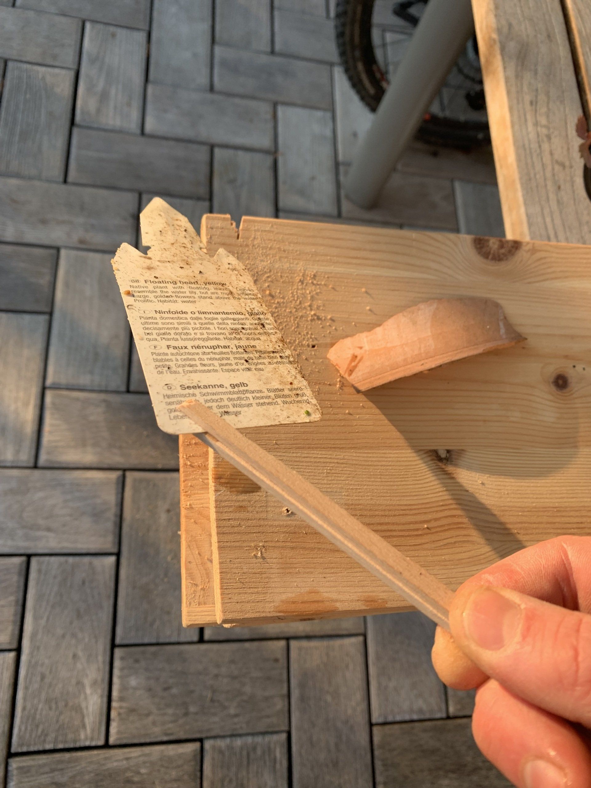 Zuerst das Wasserbad, ob die Verklebung hält und wie sich das Holz verändert nach einigen Zyklen trocken/feucht, fasert es auf, könnten man dann sich Splitter einziehen etc.